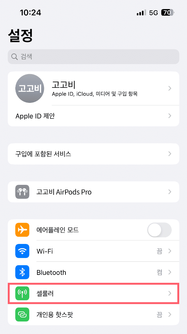 아이폰 기기 '설정'에서 '셀룰러'를 눌러주세요.