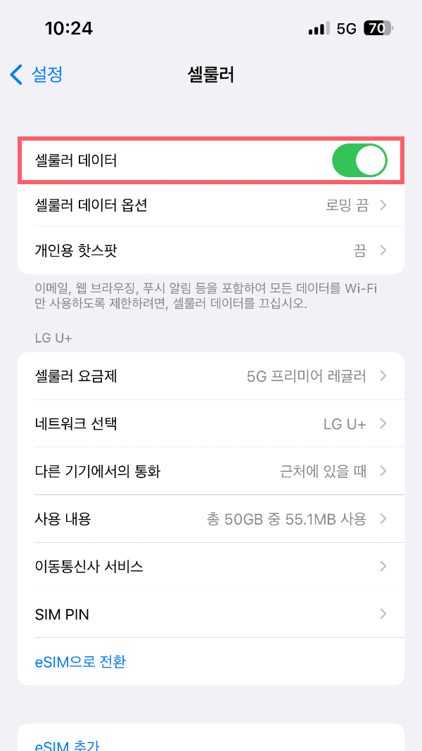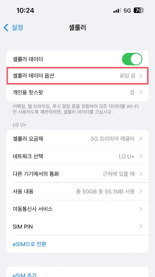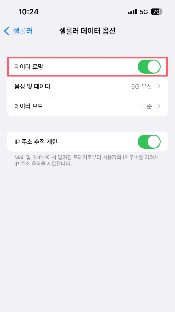 설정 → 셀룰러 → 셀룰러 데이터 옵션 →